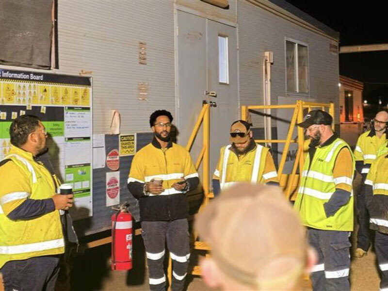 Adam (centre left) presenting a safety pre-start on site.