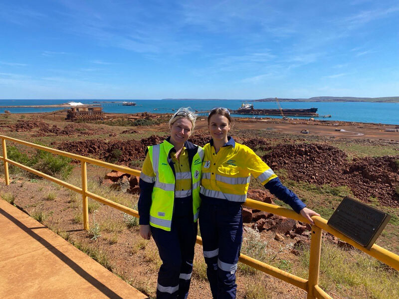 Rachael (right) visiting the on-site Projects team at Dampier.